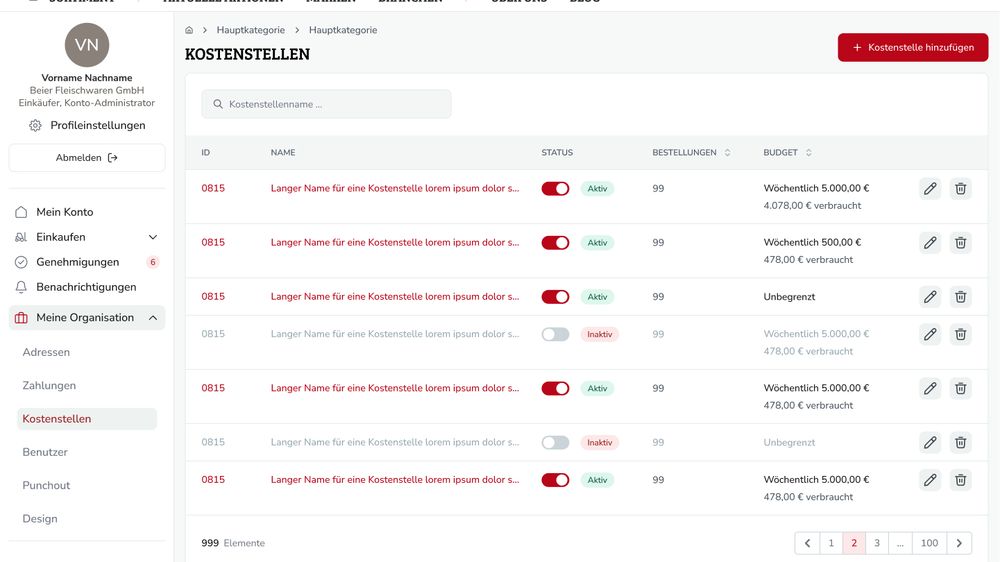 Behalten Sie Ihre Ausgaben im Blick: Mit der integrierten Kostenstellenverwaltung ordnen Sie Bestellungen klar zu – nach Abteilung, Projekt oder Standort. So schaffen Sie Struktur, vereinfachen die Abrechnung und gewinnen maximale Kontrolle über Ihre Budgets.